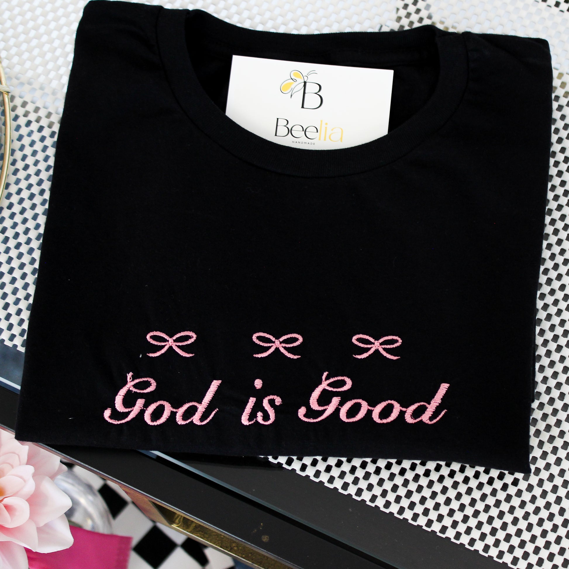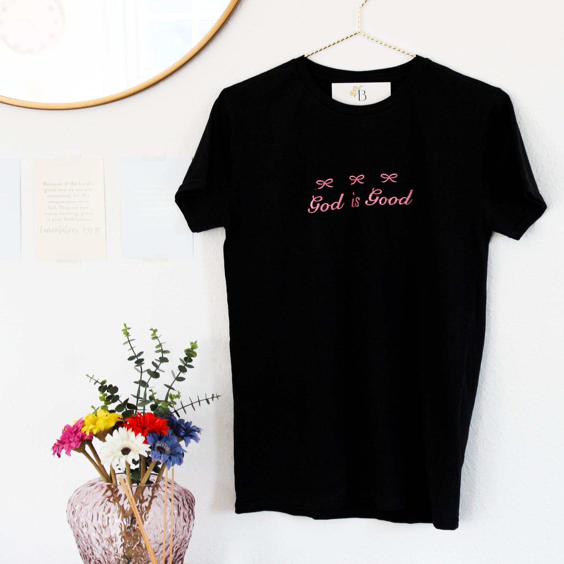 Make a cute but bold statement of faith with our embroidered GOD IS GOOD T-shirt, adorned beautifully with striking pink coquette BOWS for a sweet but subtle and a touch of elegance.