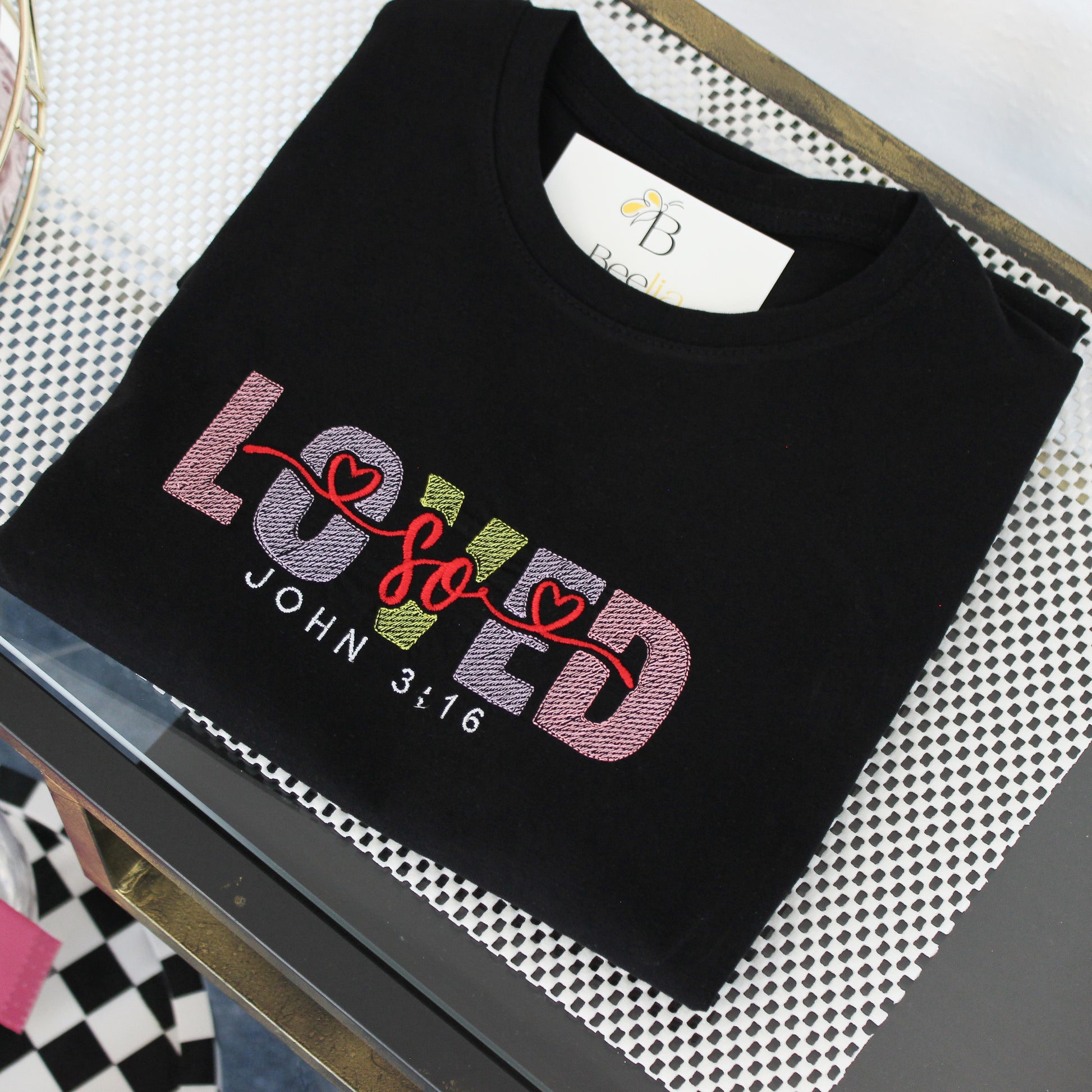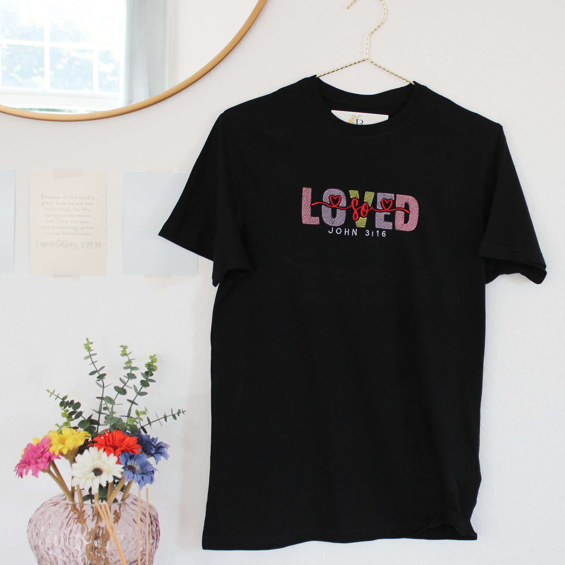 Celebrate love and faith with the SO LOVED SKETCH T-SHIRT, featuring the inspiring John 3:16 Bible verse. This playful tee showcases a charming embroidered sketch design, adding a unique artistic touch to your wardrobe. Available in classic White or Black, it’s perfect for spreading a positive message with style and comfort. Whether for casual days or meaningful gatherings, this t-shirt lets you wear your heart—and your faith—on your chest.